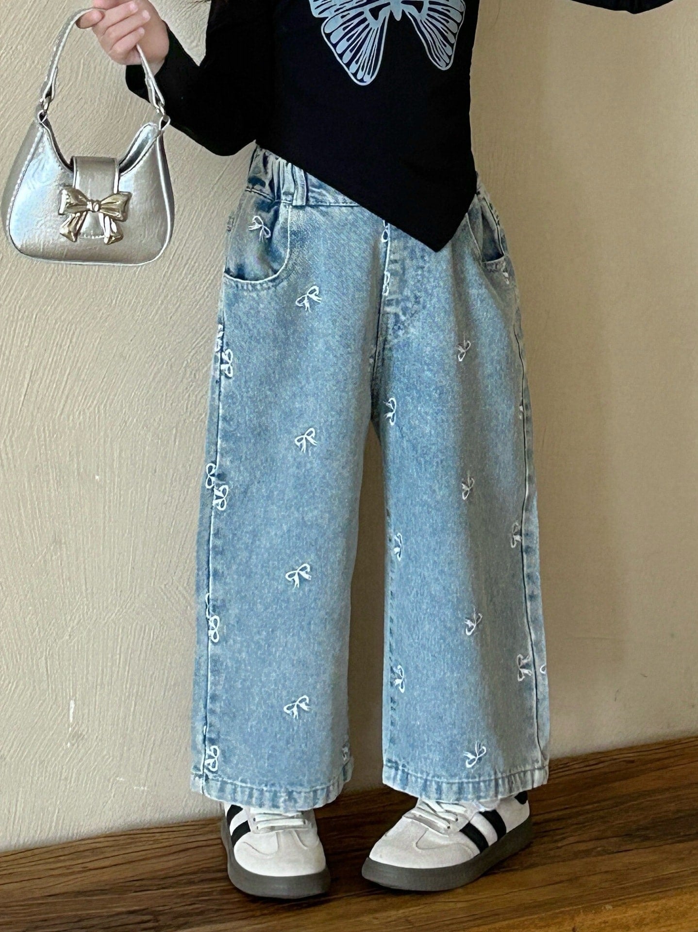 【急速出荷】新追加 大人気 2025春秋 子供服 韓国 パンツ 春の新しい女の子の刺繍弓ジーンズ子供ズボンカジュアルワイドパンツ