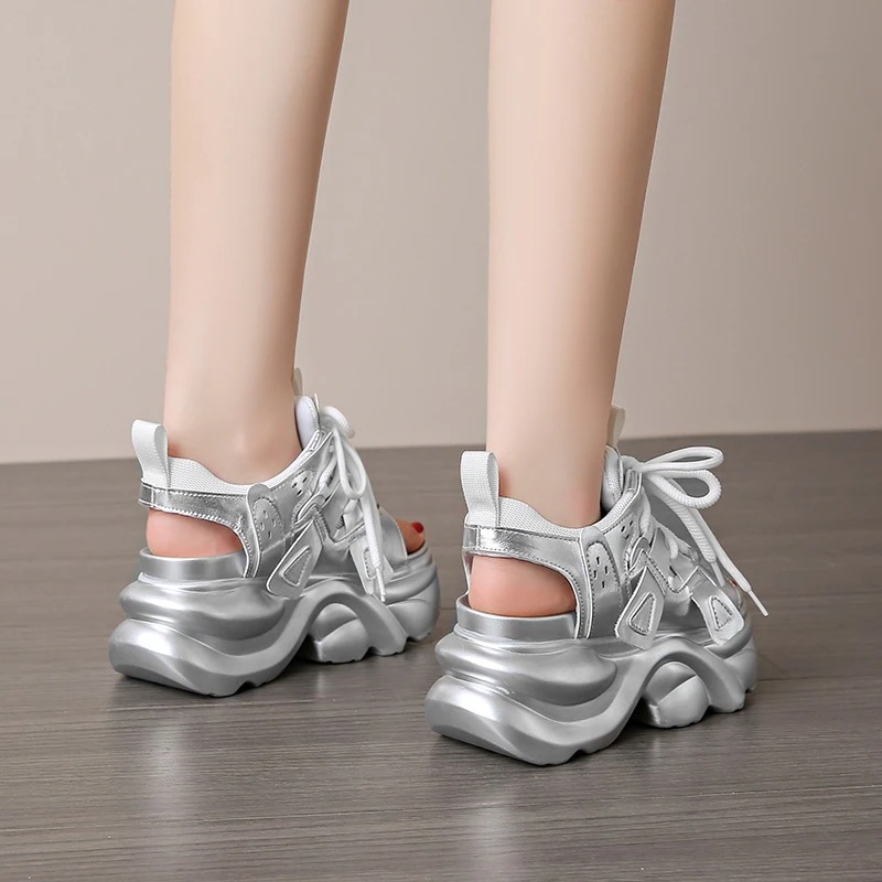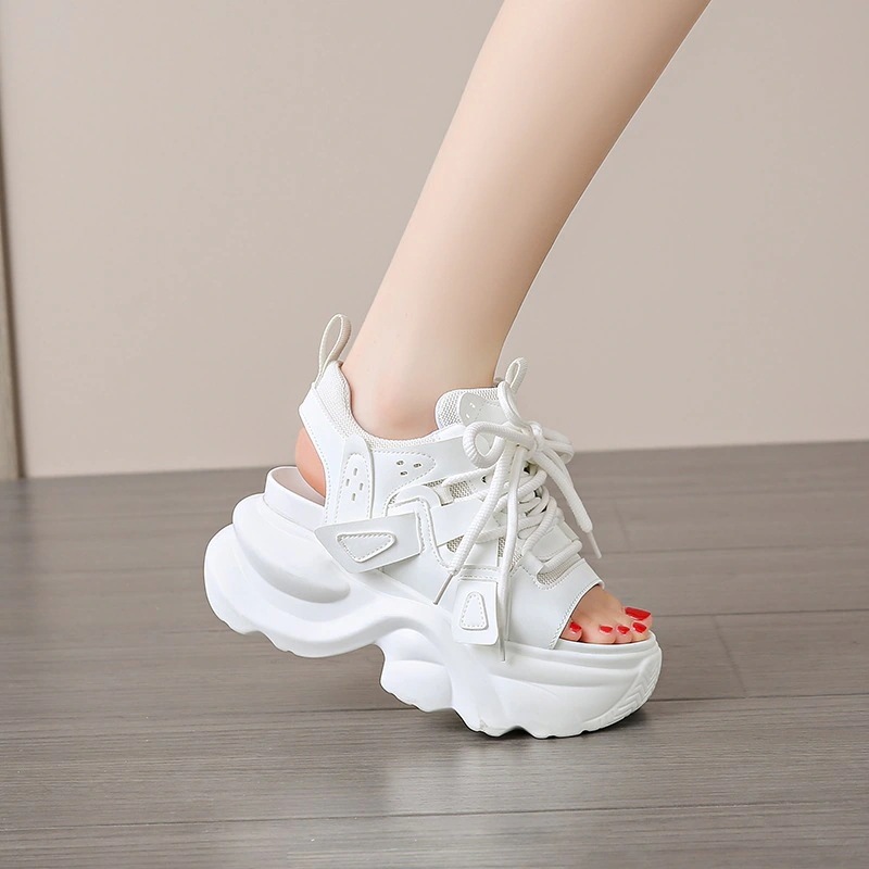 2025春夏 厚底 オープントゥスニーカーサンダル軽量通学ミュール 靴美脚脚長プラットフォームフェイクレザースエード 7cmきれいめ カジュアルPU夏コーデトレンドフレンチフェミニン大人韓国っぽ