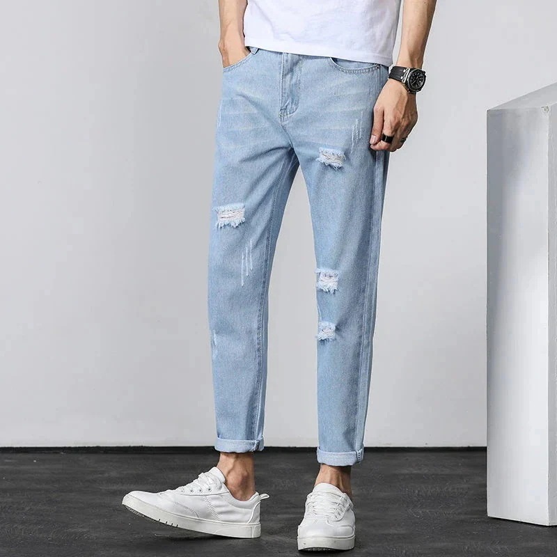迅速出荷おしゃれメンズジーンズ ルーズストレートパンツ 破れたジーンズ メンズ9パンツズカジュアルパンツ
