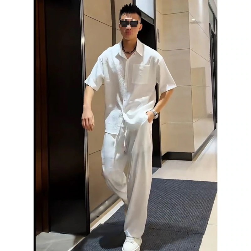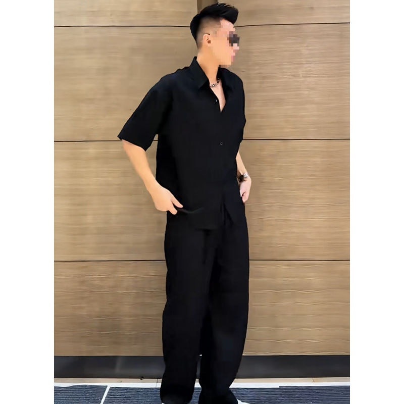2025 カジュアルスーツ メンズ 夏 コットンリネン混紡 通気性 シャツ トレンド感満載 万能コーディネート ストレートパンツ ツーピース