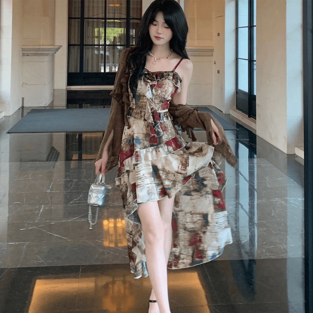 スカート裾キャミソールスカートカーディガンセット2025秋を引きずるのヴィンテージジャカードシニア油絵気質雰囲気感覚