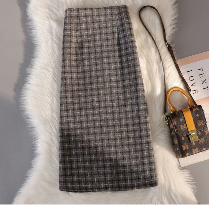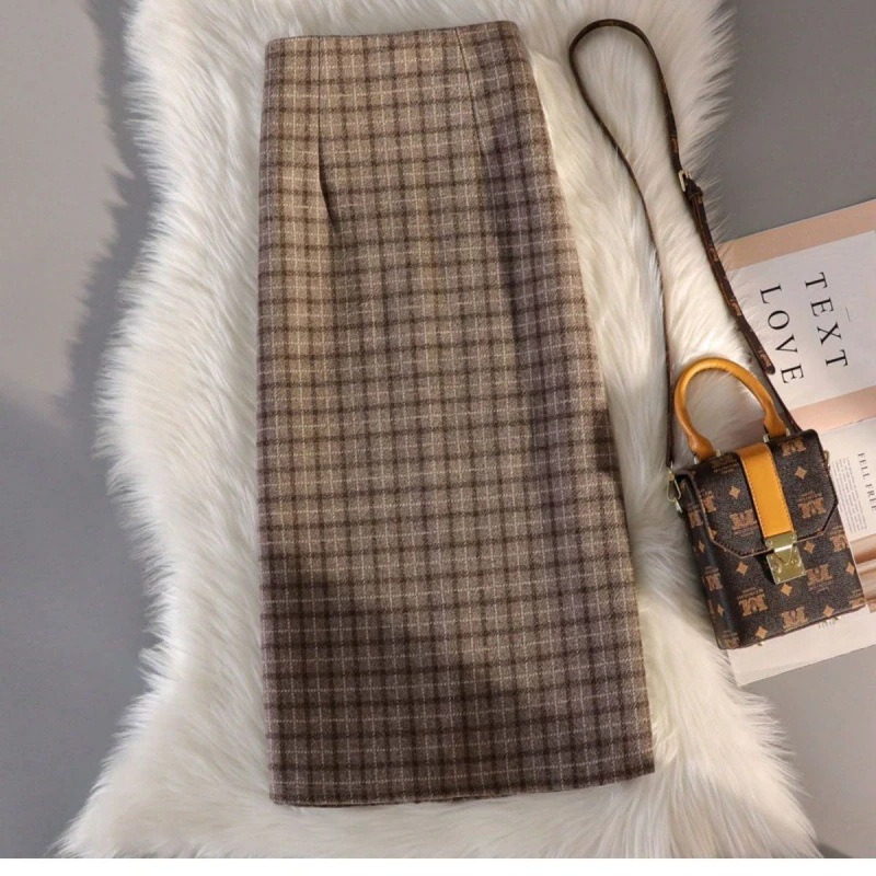 秋冬は厚手のツイードチェックの半身スカート女性新型ハイウエストA字バッグヒップスカート膝開きミディアムスカート