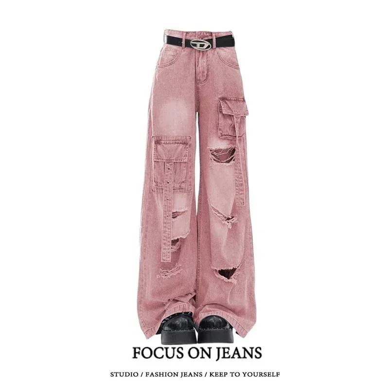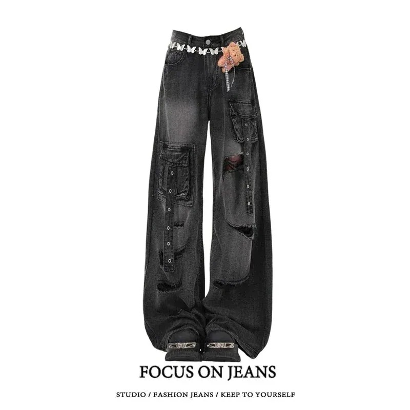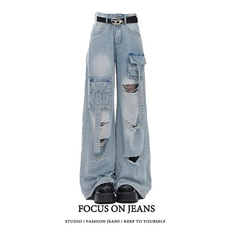 2025春夏 デニムパンツ ボトムス ハイウエスト ジーンズ K-POP ストリートファッション系モップ韓国風ファッション練習ジーンズ シルエット加工ゆったりレッグレディースカジュアルジーパン衣装