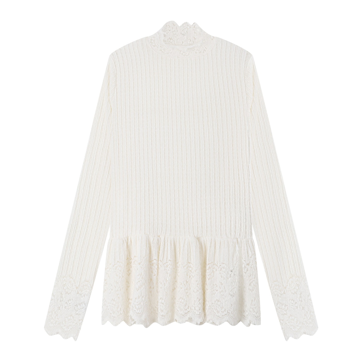 繊細レースで大人の甘さを レース ドッキング リブ カットソー レディース 長袖 ハイネック ペプラム トップス チュニック 裾フリル 異素材重ね着インナー体型カバー上品きれいめ韓国秋冬アプリコット