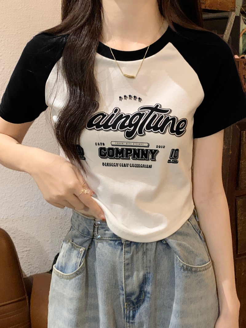 2025春夏 Tシャツ レディース 半袖 韓国風 プリント ショート丈 トップス スポーツミックスストリートバイカラーおしゃれ系グラフィックラウンドネックスリーブカジュアル大人可愛いスポーティー配色T