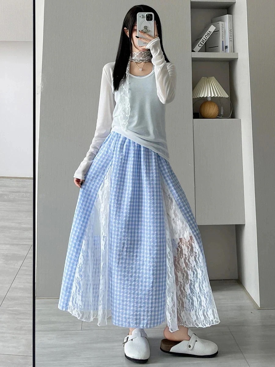 急速出荷韓国ファッション 百掛け クブルーチェック パッチワーク レース 半そでスカート レディース 気質 ラインロングスカート
