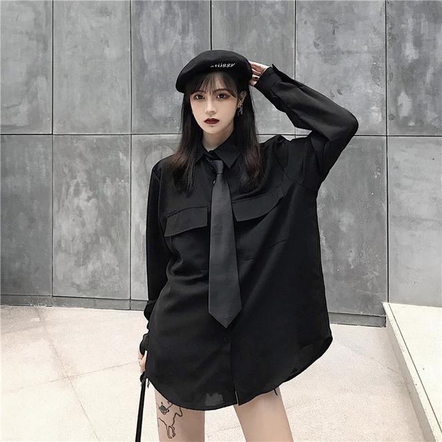 シャツ 黒長袖シャツ韓国ファッション 百掛け カレッジ風春トップス ネクタイを贈る トップス シースルートップス ブラウス