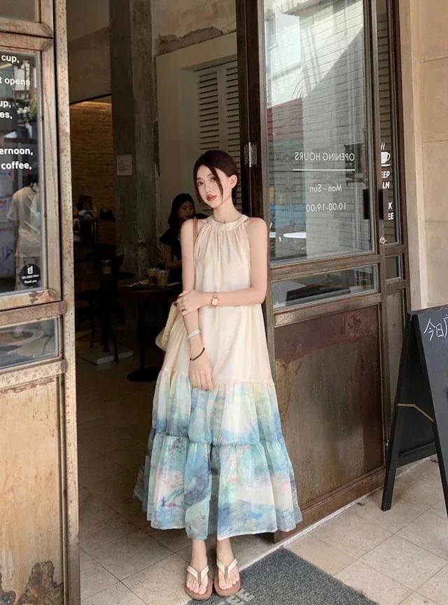2024夏 韓国ワンピース ドレス ホルターネック ノースリーブ ロング丈 Aライン ゆったり 細見え 夏 青 ブルー きれいめ おしゃれ かわいい 韓国ファッション レディース お出かけ