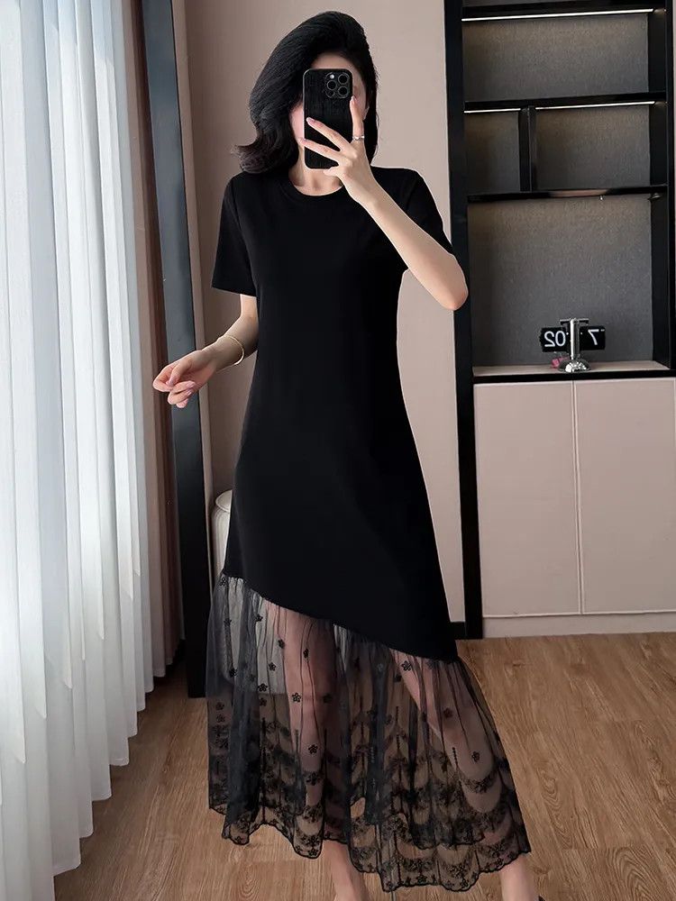 フレンチレースのパッチワーク2025 年夏のポリエステルダレスドレス女性用スリムデザインリラックスフィット新モデルビッグサイズ半袖黒色のスカート