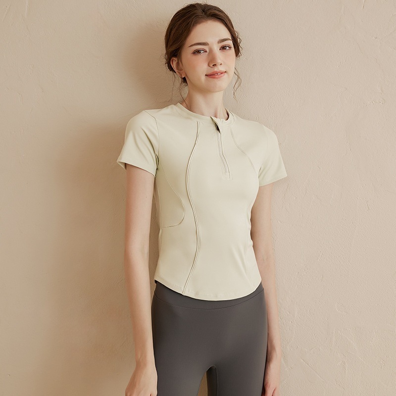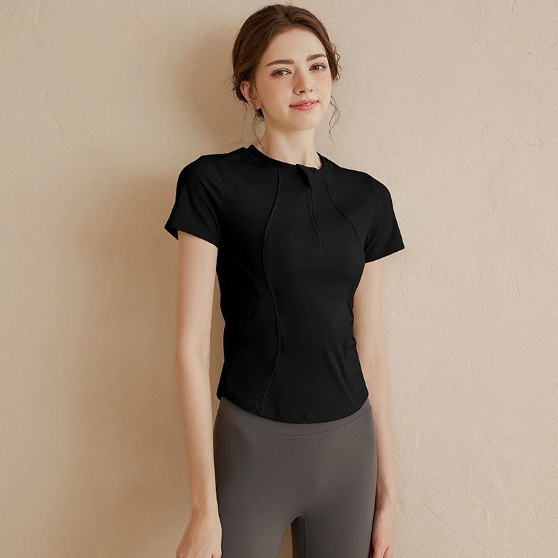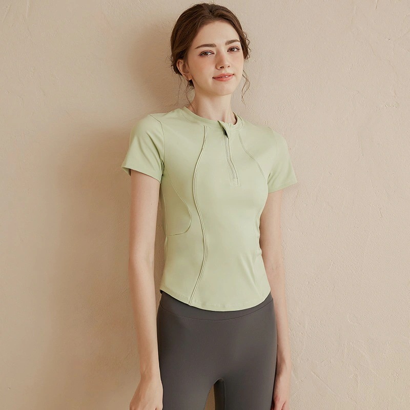 迅速出荷フィットネストップス女性夏ストレッチハーフジップ薄手部スポーツTシャツタイトヨガウェア半袖