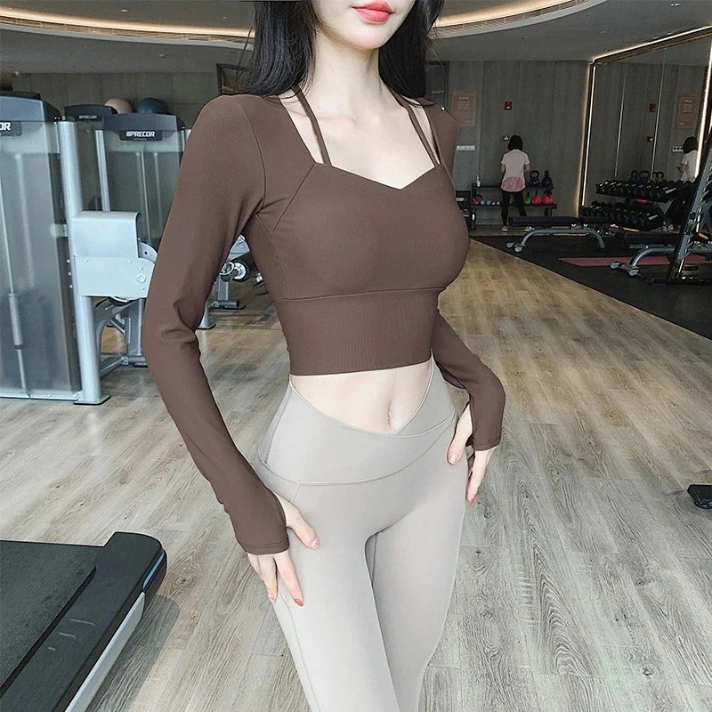 迅速出荷ヨガウェア 胸パッド付き トップス タイト トレーニング 長袖 フィットネスウェア