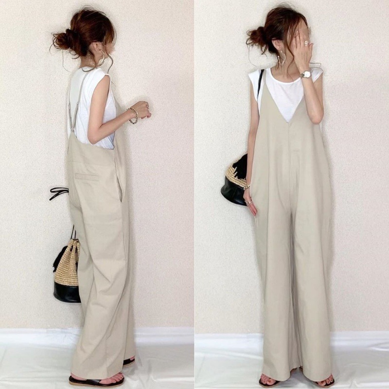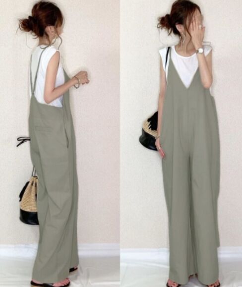 コーデ完成!サロペット 夏の新作 ストラップパンツ 単色カジュアルゆったりワイドレッグパンツ