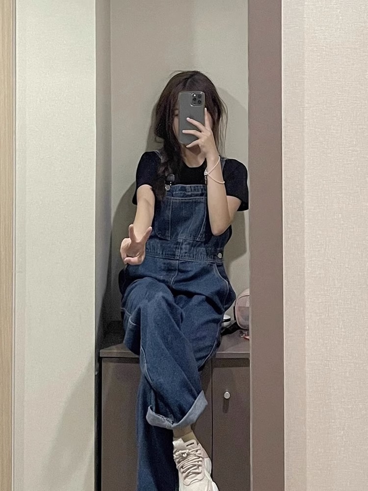 デニムサスペンダーパンツ大サイズ新作ワイドレッグパンツ