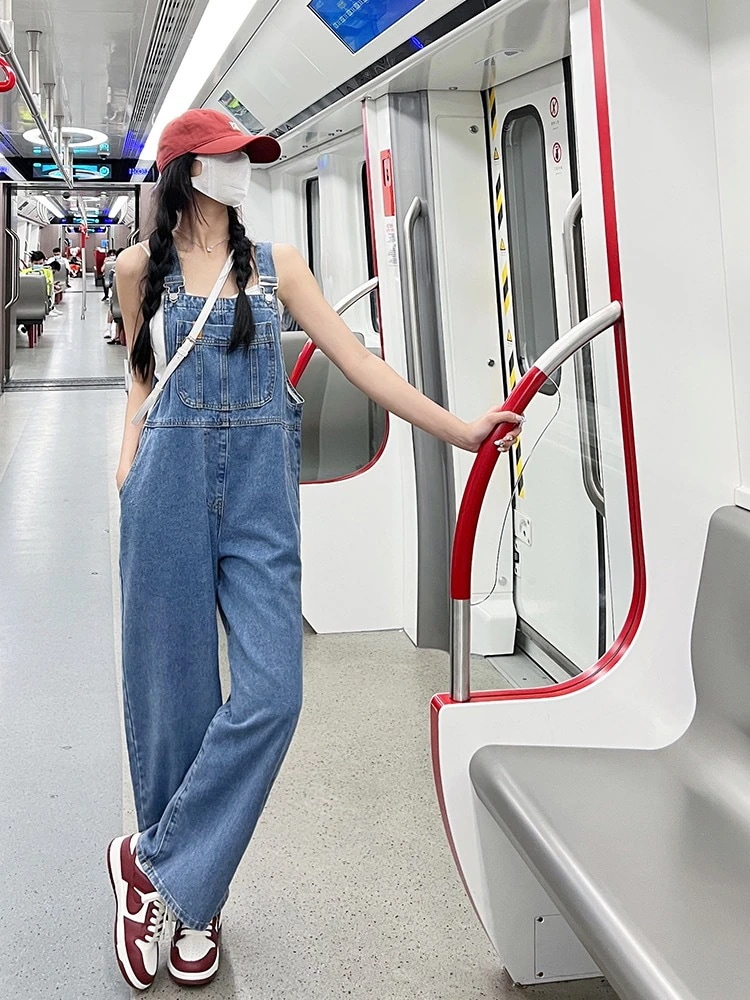 デニムサスペンダーパンツ女性用薄手ゆったりワイドレッグパンツ