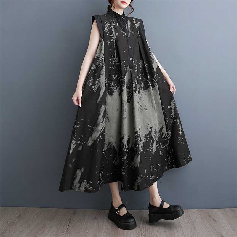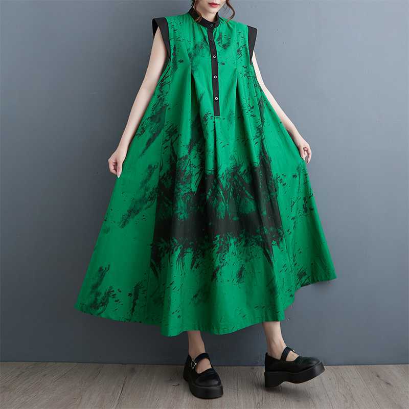 「ファットガール」 夏 ノースリーブ ロングワンピース 水墨柄 Aライン 大きいサイズ 体型カバー レディース ワンピース
