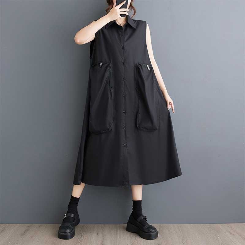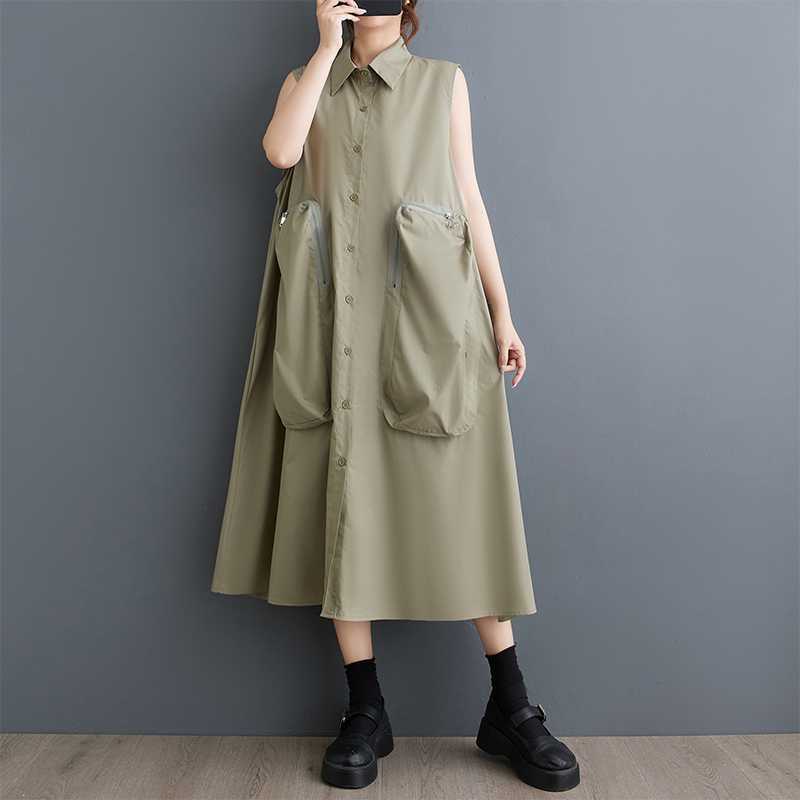 「ファットガール」 夏 ノースリーブ シャツワンピース ポケット付き 大きいサイズ 体型カバー 袖なし カーディガン