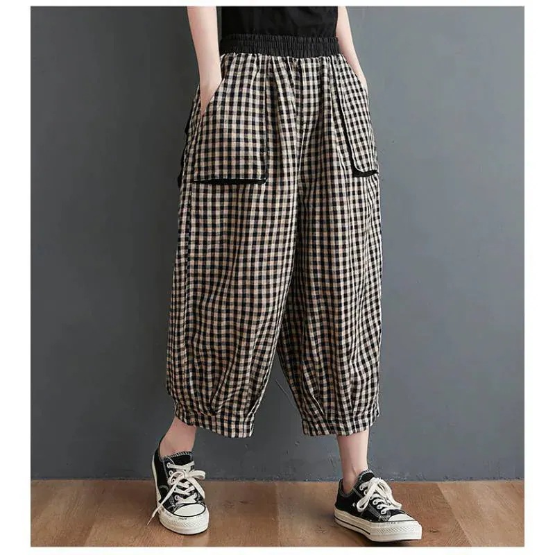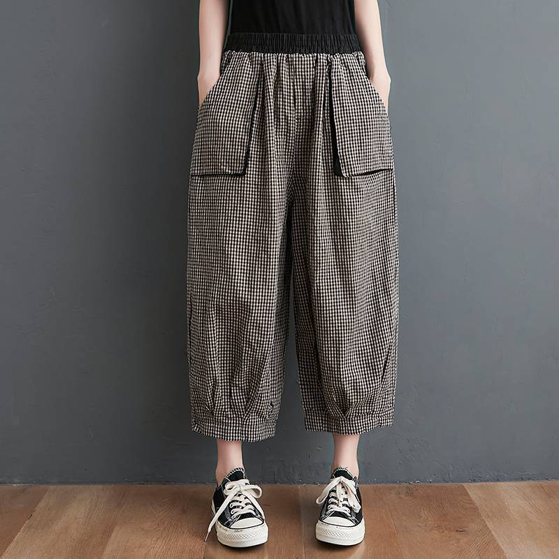新作 アート レトロ コットンリネン チェック 七分丈 ゆったり ビッグサイズ ランタンパンツ レディース