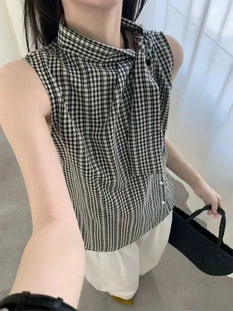 刺繍 チェック トップス おしゃれ ストライプ シャツ ノースリーブ 上品 カジュアル ゆったり トップス タイアップ ネックホルダー シャツ レディース
