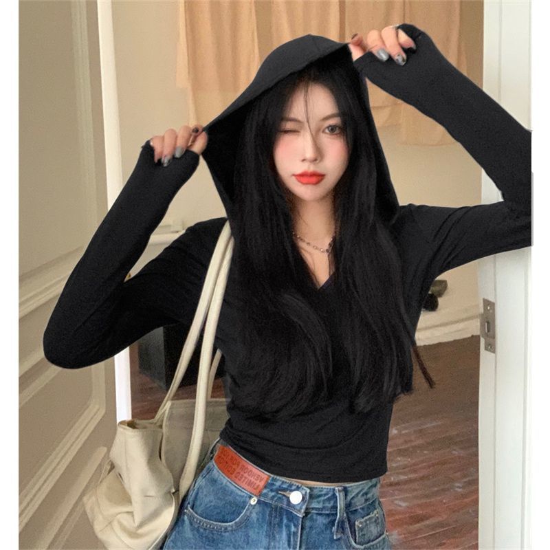 【人気商品】パーカー 韓国ファッション フード付き スリミング ins スウェット 百掛け ニッチデザイン 長袖 Tシャツ 着痩せ ショート トップス