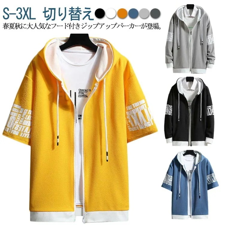 ジップアップ メンズ トップス 大きサイズ 半袖パーカー プリント 部屋着 夏 フード付き 切り替え 春物 運動着 パーカ ルームウェア スポーツウェア メンズファッション 春服 長袖 夏服 夏物 秋