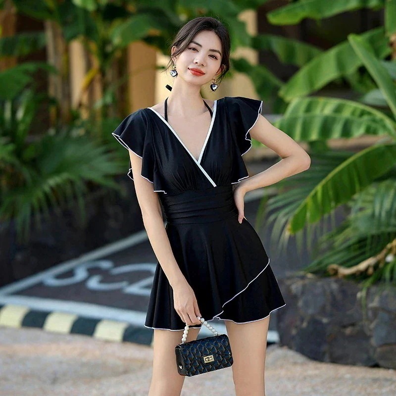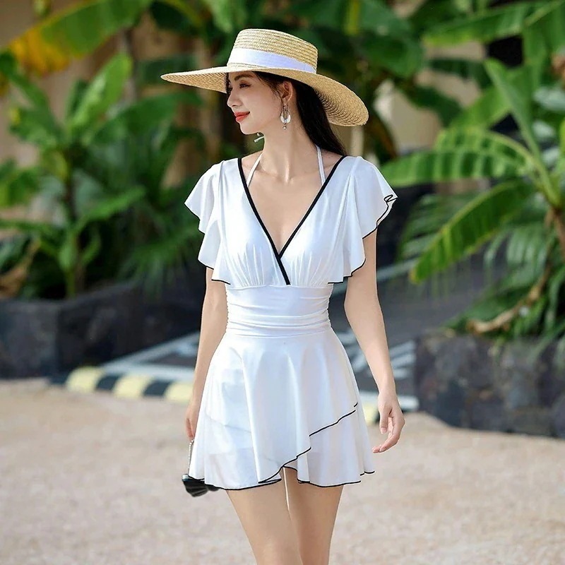 水着 韓国ファッション 2025 レディース 無地 Vネック 着痩せ 体型カバーオールイン水着 水着 ビキニ 海水浴 旅行海边ガード
