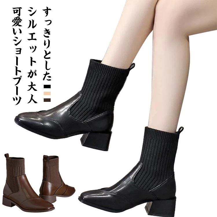 ソックスブーツ ニットブーツ ローヒール レディース ショートブーツ スクエアトゥ 秋冬 シューズ 防寒 PU革 チャンキーヒール 履きやすい 疲れない ストレンチ 撥水 軽量 通勤 靴下ブーツ 美脚