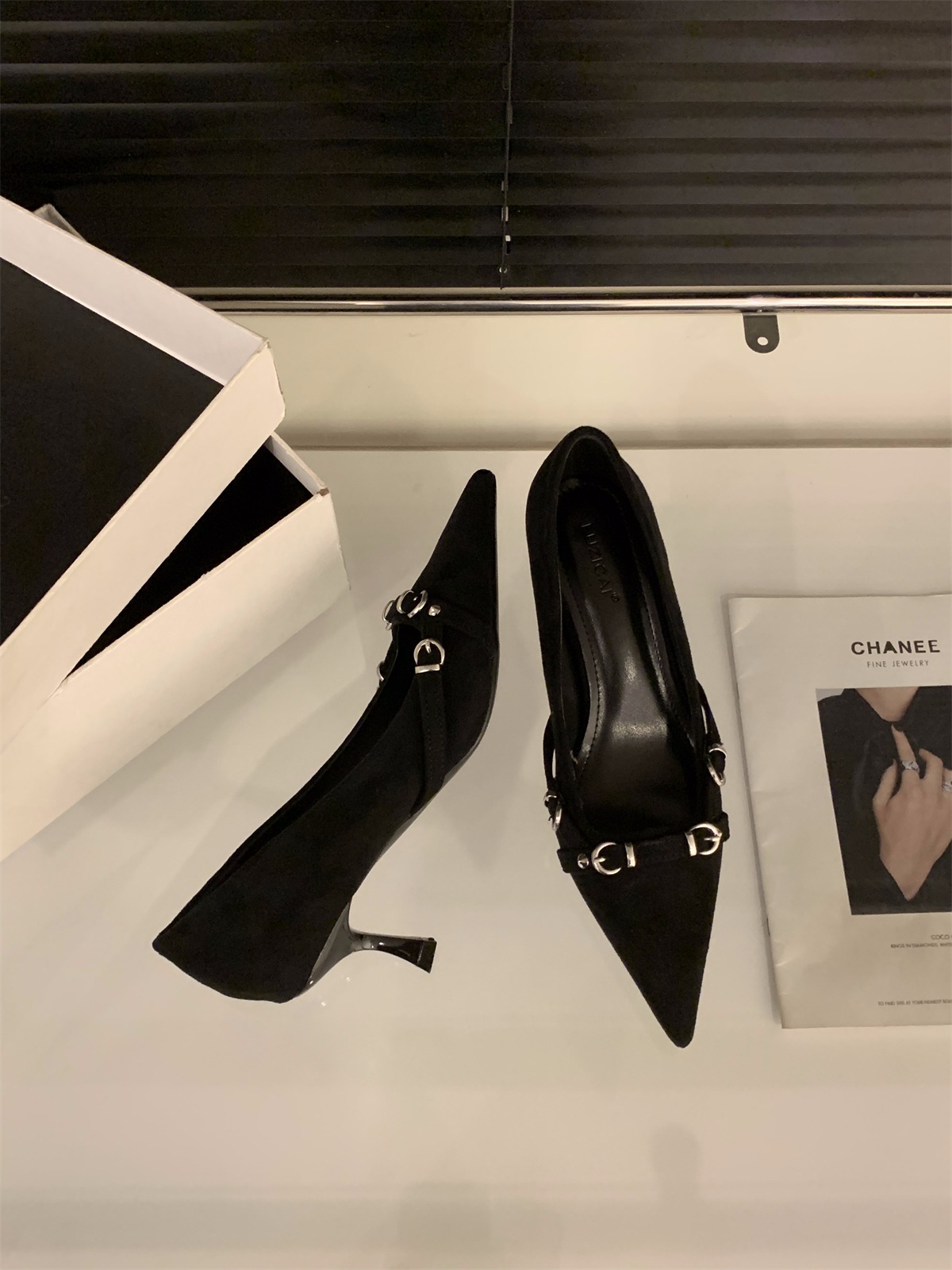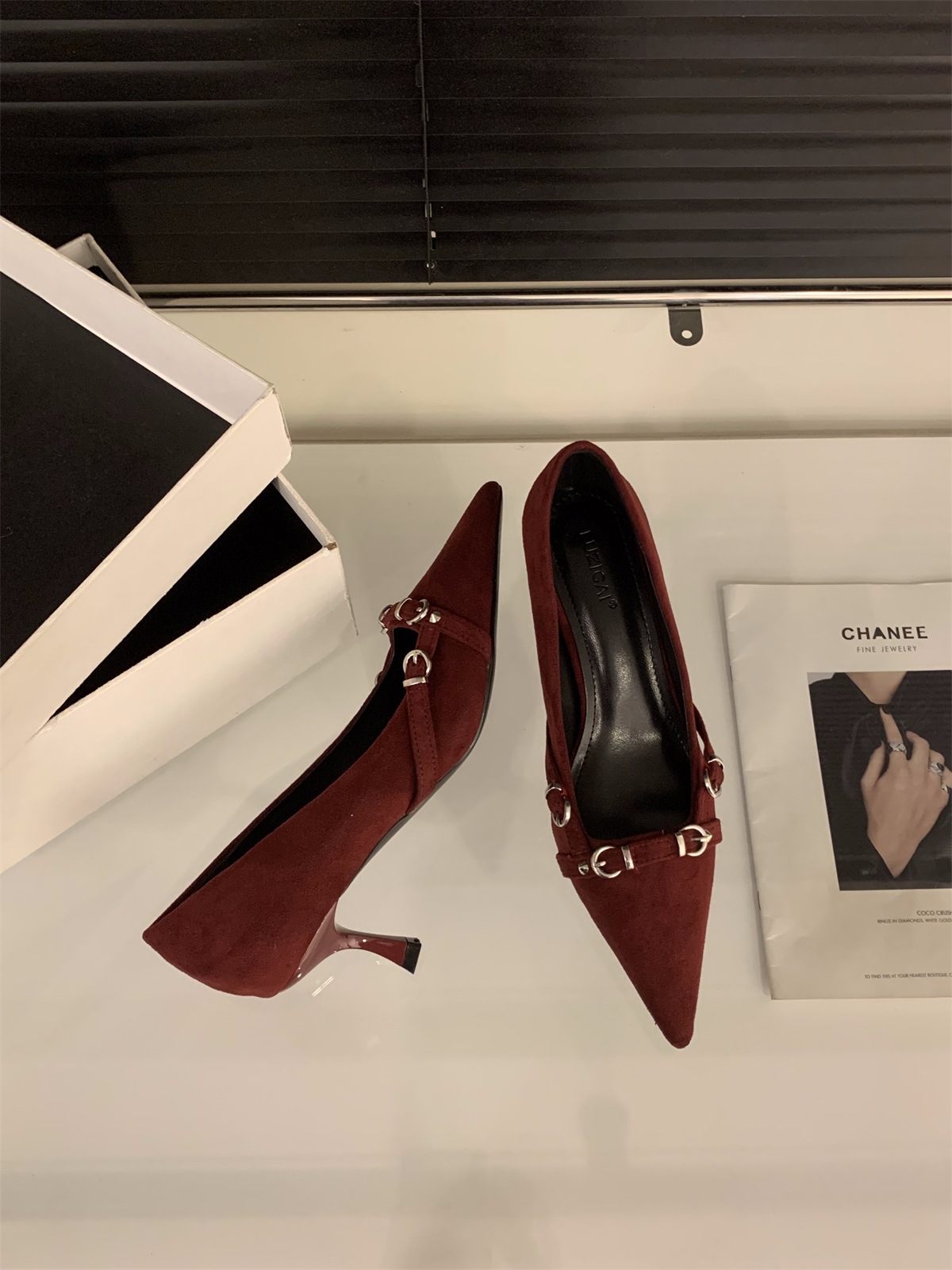 フランスの先の尖ったつま先の黒いハイヒールの女性靴2024秋と冬の気質スエードスカートレッドウェディングシューズシングルシューズ