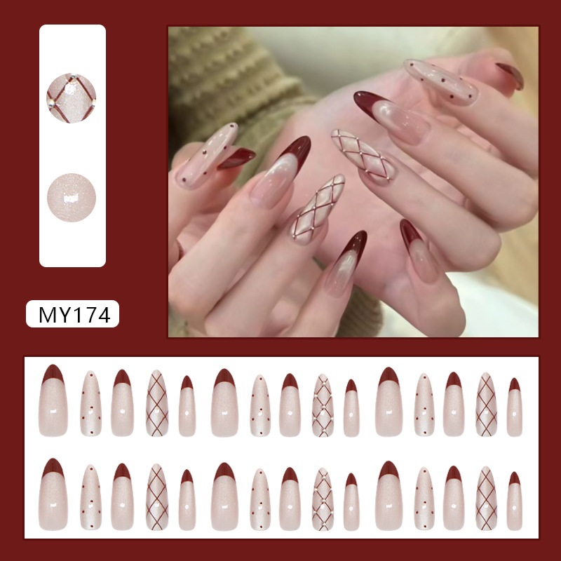 アンコールラ紅菱格気質波点キャッツアイフレンチドリル風取り外し可能ネイルチップ30枚