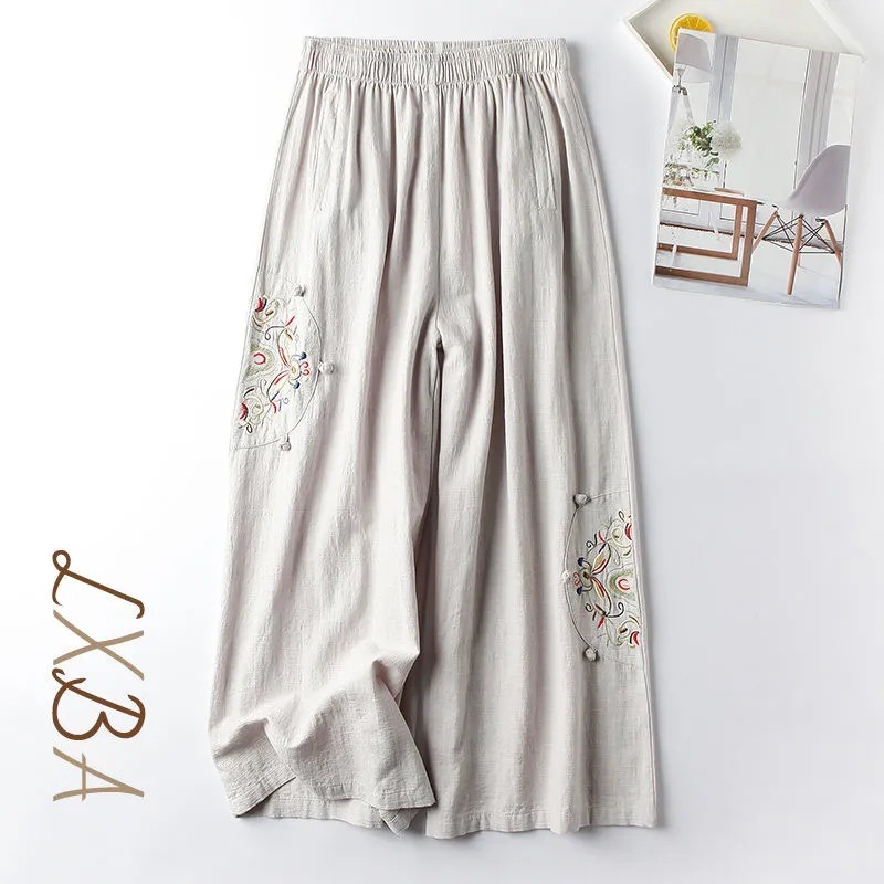 【2枚購入2OO円OFF]】ワイドパンツ 綿麻 夏 秋 刺繍 ガウチョパンツ 無地 柔か軽か手触り良くゆったりら楽ちん 四季 9分丈 麻風リネン風 韓国ファッション レディース 綿麻 パンツ 美脚