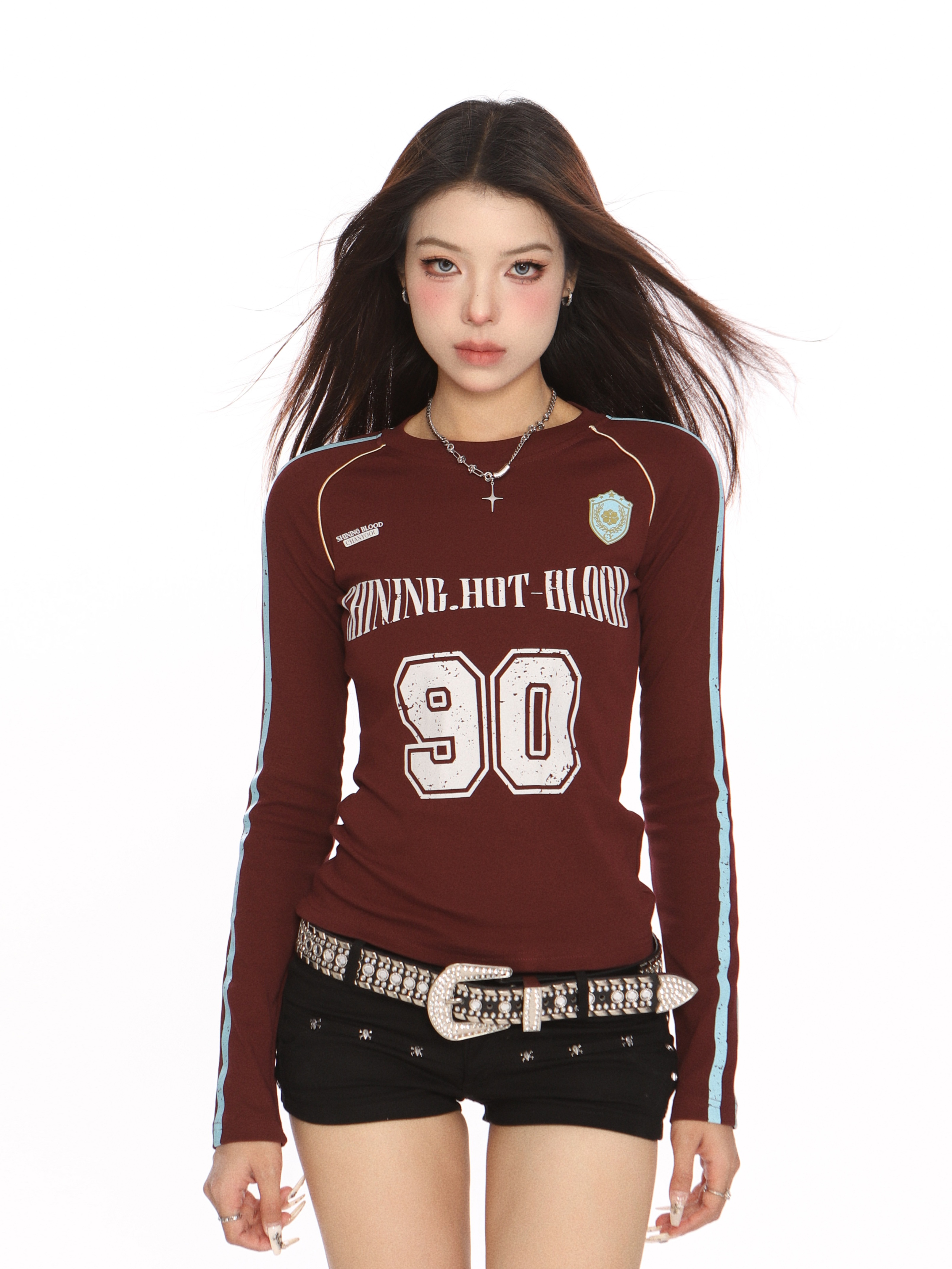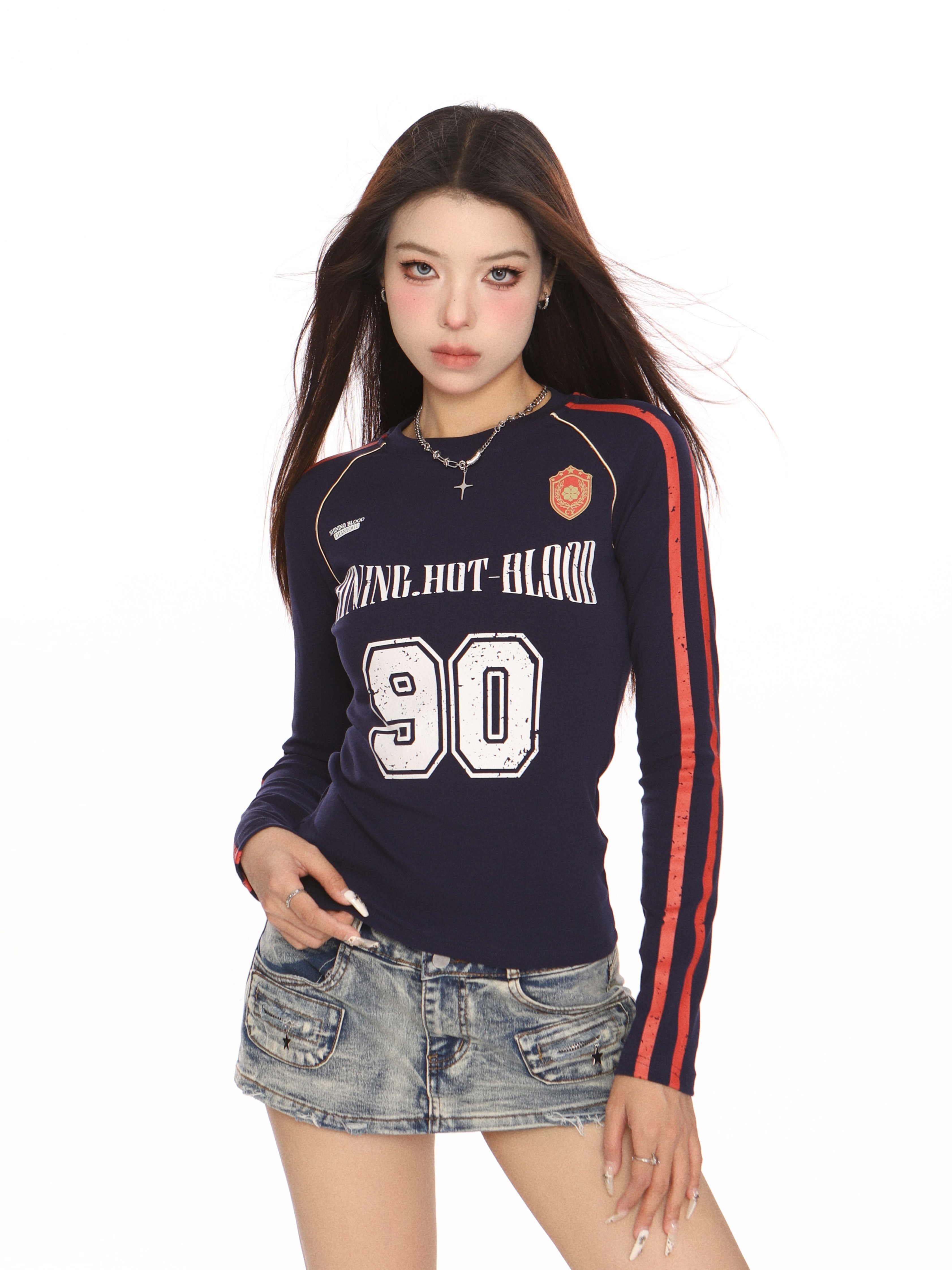 2025春夏 Tシャツ長袖韓国風Vネックプリントダンスショート丈タイトトップスレディーススポーツミックスストリートバイカラーおしゃれ系スリーブカジュアル大人可愛いスポーティー配色フットサイドT