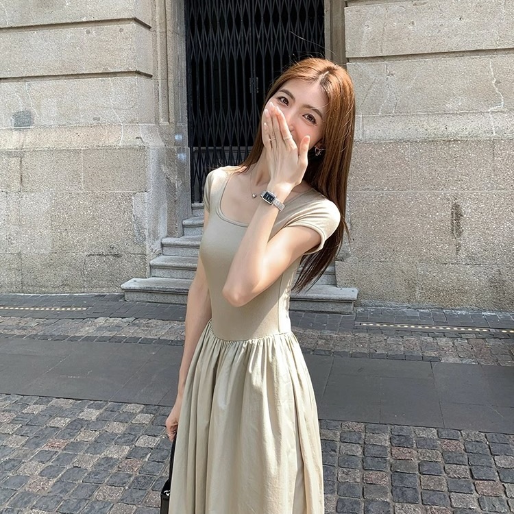 スクエアカラーのビッグスイングスカート洋ナシシェイプのAラインスカート女性のホリデースタイルカバークロススリムTシャツスカートロイヤルシスターリトルブラックスカート夏