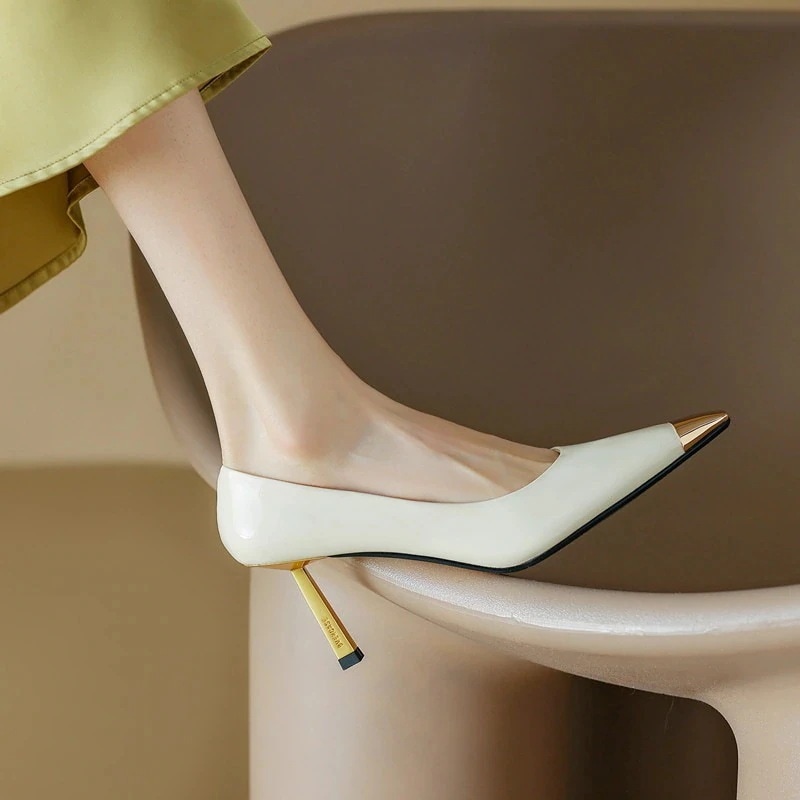 韓国ファッション スタイルアップヒールパンプス メタルヘッドハイヒール女性黒24正方形の頭のパテントレザー白の気質ファインヒールシングルシューズ サンダル