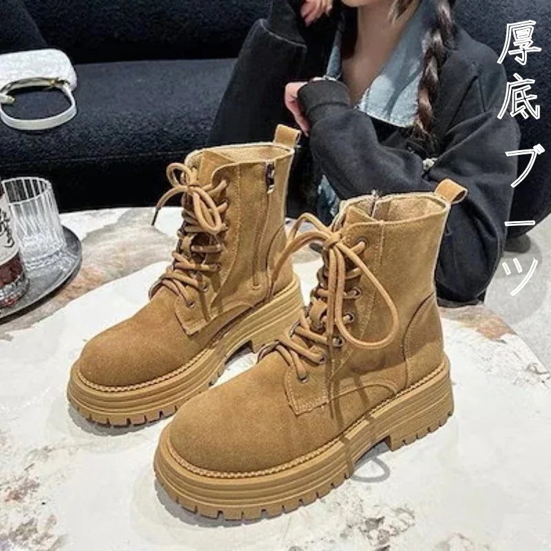 レディース 厚底 つや消し ショートブーツ の新作 ブーツ チャンキーヒール 24 カジュアル 韓国 マフィン レース