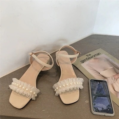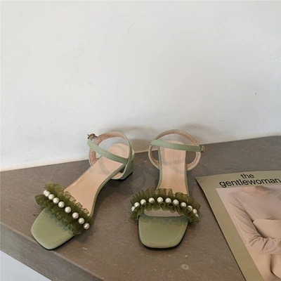 節にピッタリスタイル ファッション 新作 sweet系 パール 滑り止め 一字型ボタン 快適 ジェントルスタイル 気質 サンダル 百掛け 太いヒール