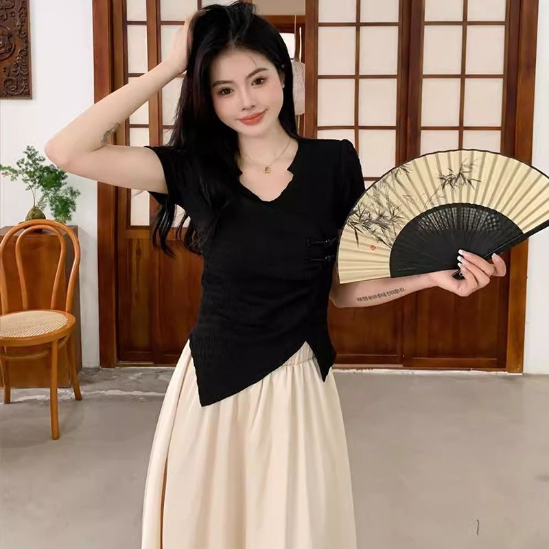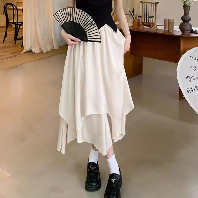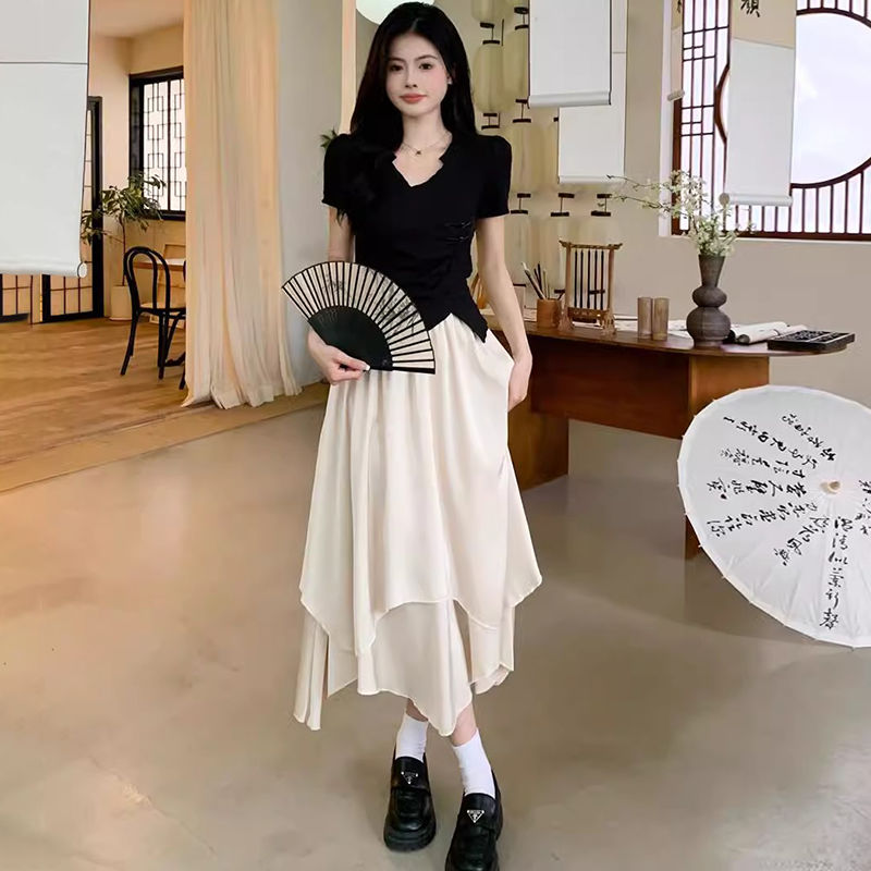 カジュアルファッション夏の女性のフルセット純色不規則修整着着着やせた上着の垂れ感だるい風半身ロングスカート