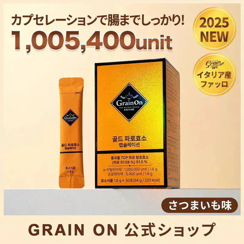 普段の1食の量は、1人前より少なくて、炭水化物(パン・お米・パスタ類)とかも食べないのですが、会食やお出かけの時に、提供されたものを残す訳にもいかず、頑張って食べると苦しくて苦しくて、すごく気持ち悪くなるので、何か手助けしてくれるものないかな?と探していたときに、酵素良いかも!と思い、いろいろと調べていたら、こちらのGrain onさんを見つけました!いろんな種類や効能、味があり、迷いに迷ったので、レッチェレンテファッロ酵素、レッチェレンテファッロ酵素G、ゴールドファッロ酵素カプセレーション、3種類購入してみました!さらさらのパウダーのものは、レチノールやビタミンなどで飲んでいましたが、Grain onさんの酵素は、さらに細かな粉末で、むせないように少しずつ口に入れて飲みました!味は、それぞれの小豆、ピーナッツ、さつまいもの優しい甘さで、美味しく頂けました◎普段の食事の後に試しに飲んでみたのですが、飲んだ後(数時間後くらい?)、腸がすごく動いているのが分かって、酵素が効いているのかな?と実感しました!腸活にも良さそうなので、食事内容に合わせて、1日1包食後に飲むのを続けてみようと思います!力価数値も高く、1日2包までとのことなので、外出した日は2包飲んでみても良いのかな?と思います!配送も韓ダッシュではないのに、韓ダッシュと同じ日数で届いてびっくりです!