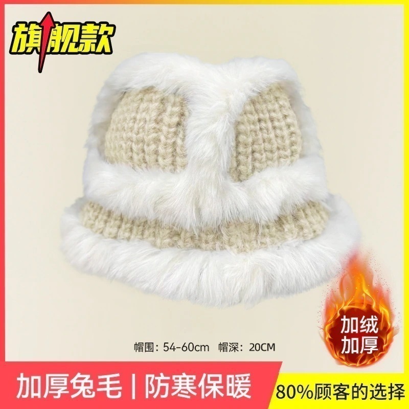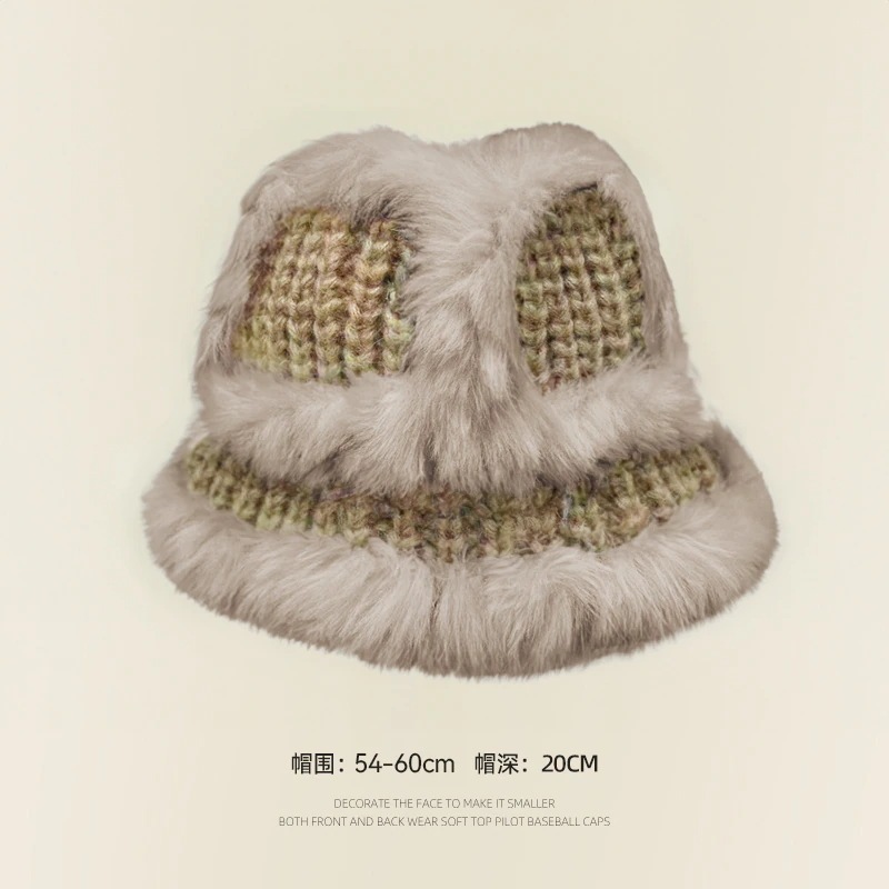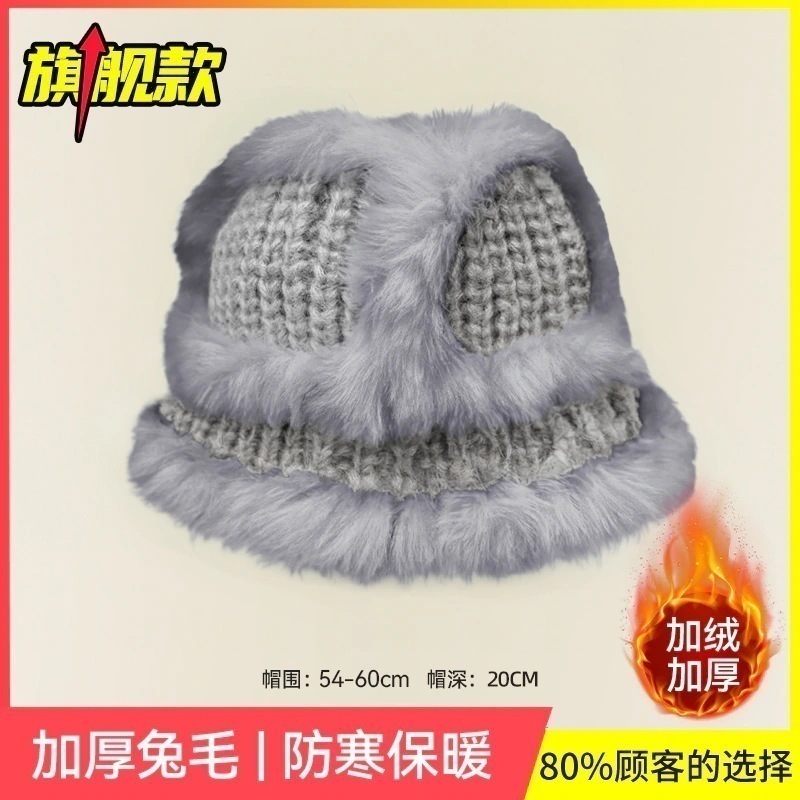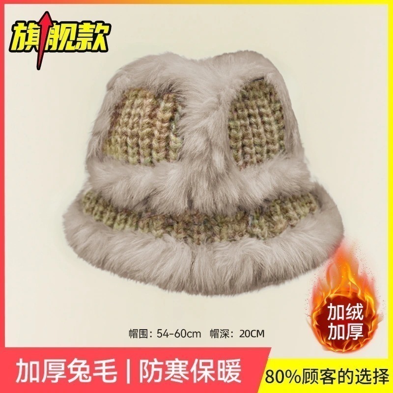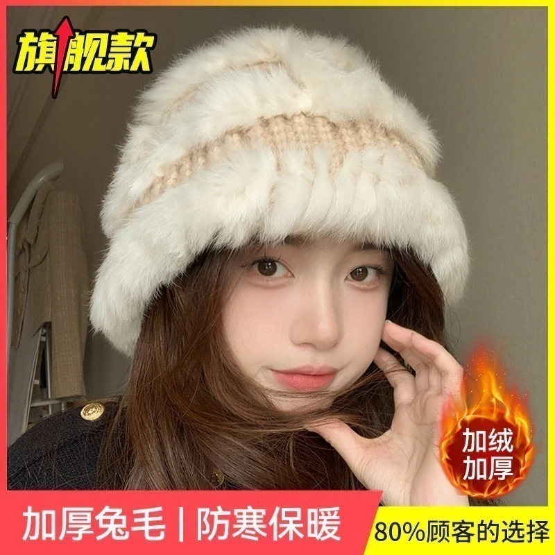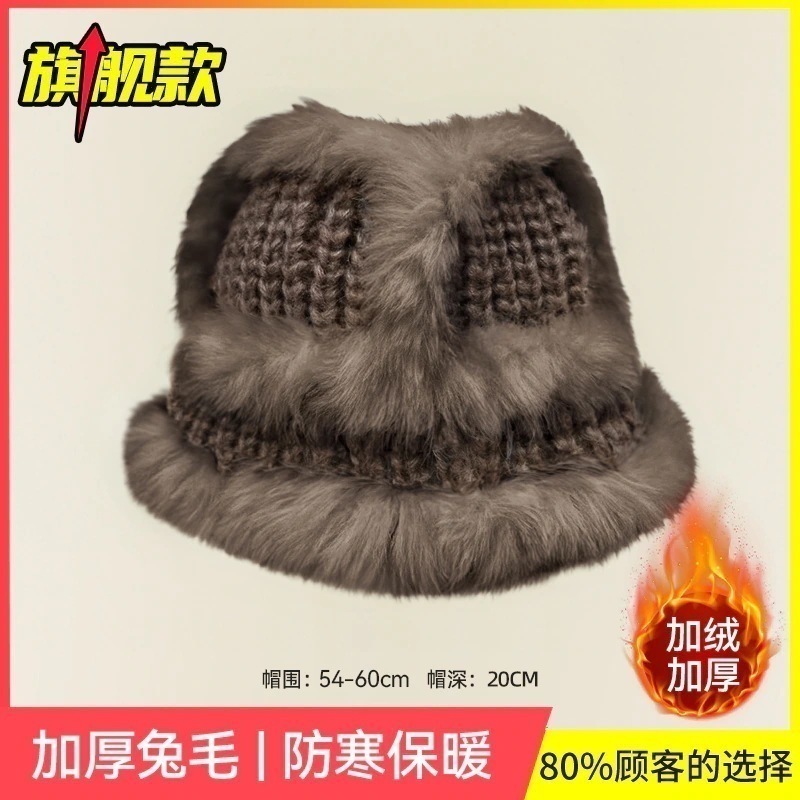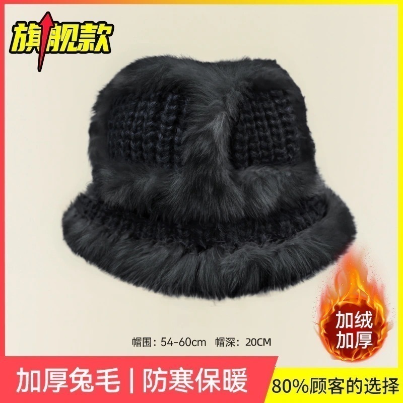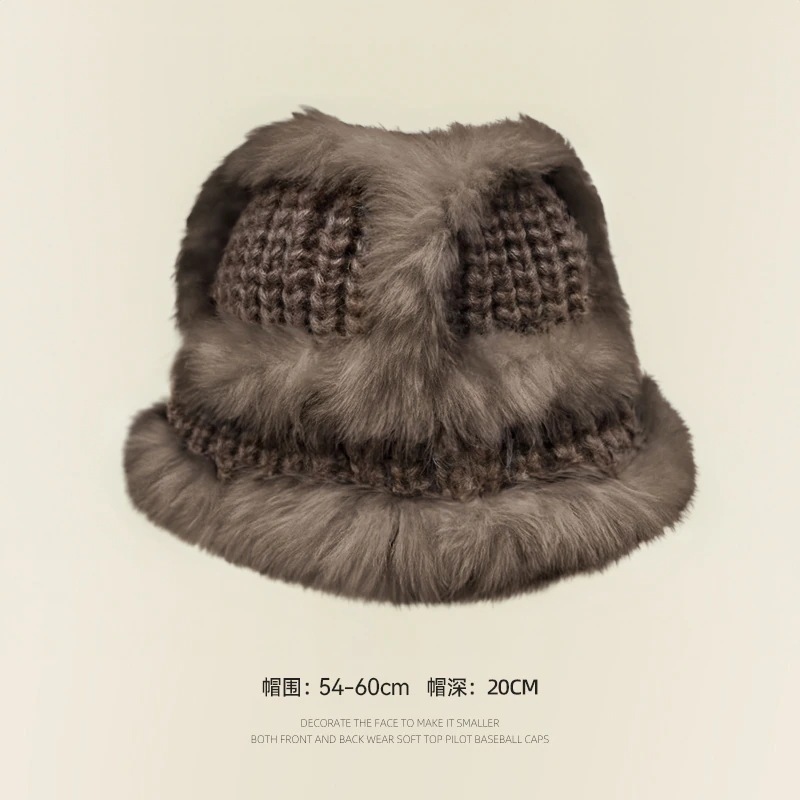 の女性用リアルラビットファーニット帽子スタイルの大きなヘッドバンド耳保護ウール帽子緩い厚く暖かい漁師盆地帽子834