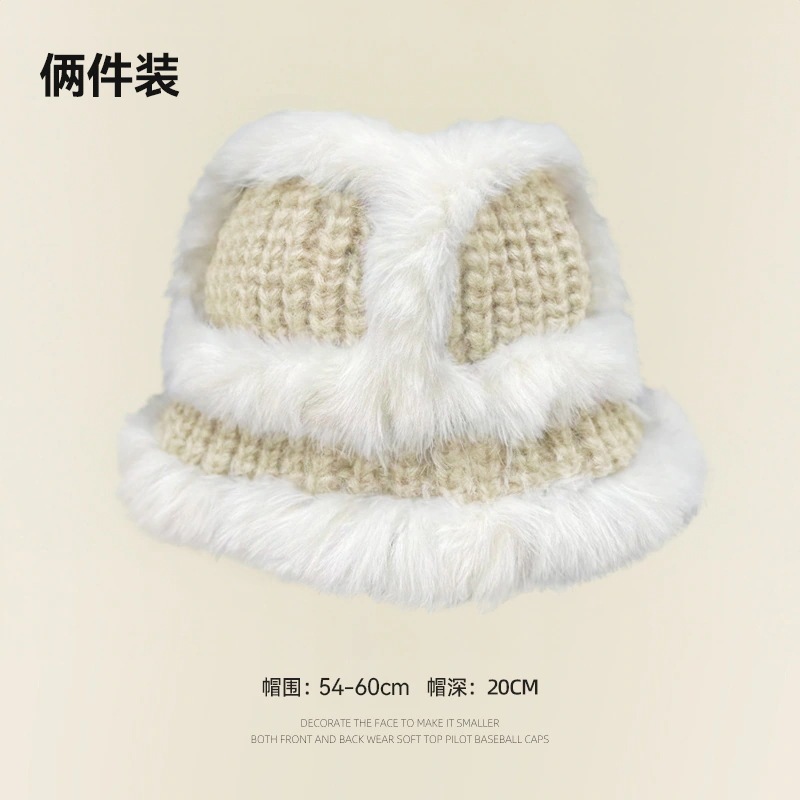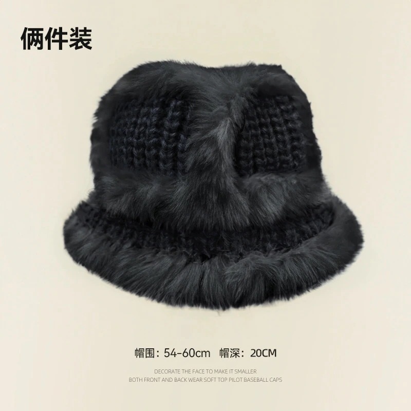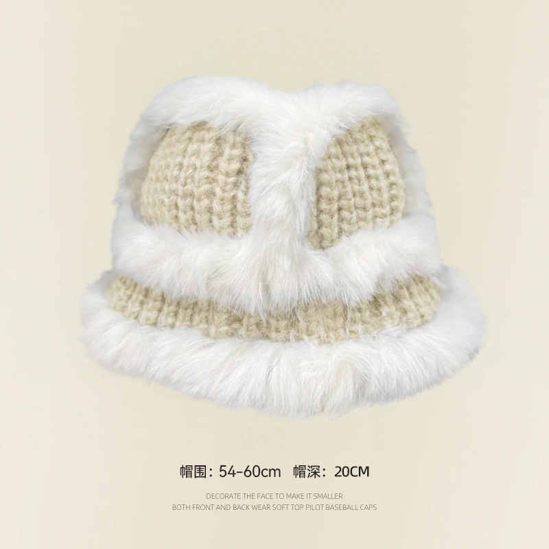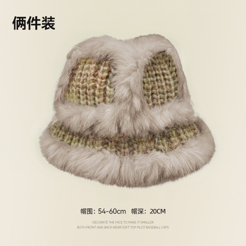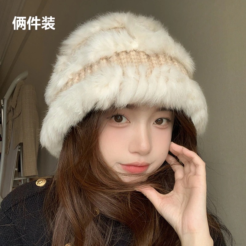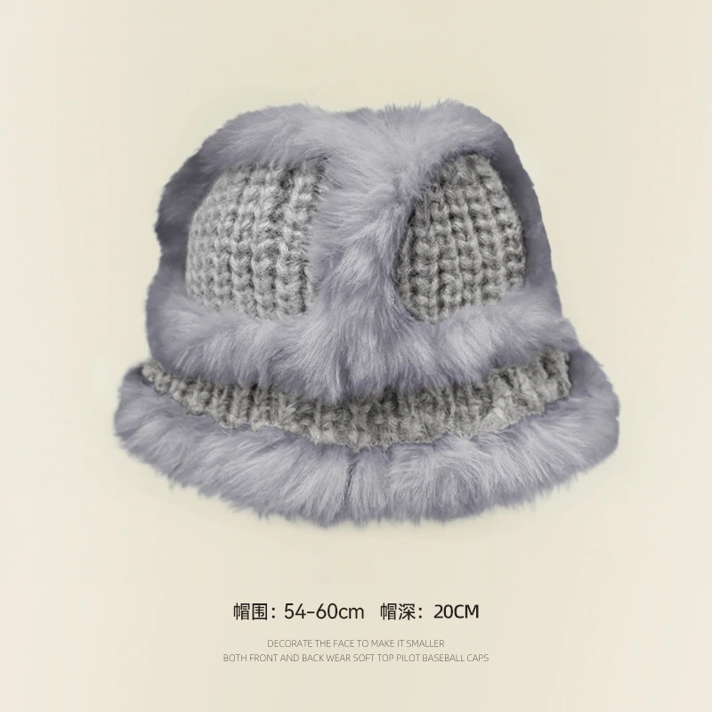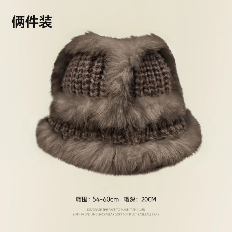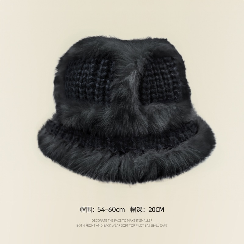 の女性用リアルラビットファーニット帽子スタイルの大きなヘッドバンド耳保護ウール帽子緩い厚く暖かい漁師盆地帽子834