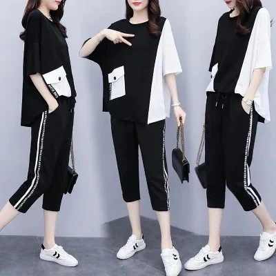 涼しく楽ちんセットアップ レディース 夏 韓国 半袖 ルームウェア セットアップ スウェット上下セット 大きいサイズの2つのセットの女性の夏の太ったmmの衝突色 スーツ