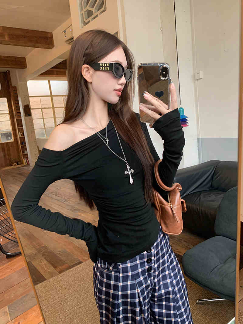 T 2025春夏 Tシャツ カットソーラウンドネックK-POPトップスカジュアル配色韓国系ストリートへそ出しタイト 肌見せ 着痩せVネックスリーブ ショート丈 ファッションレディースかわいいサイ 長袖