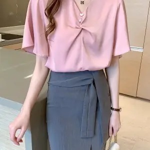 トップス無料!【上品】シフォンブラウス 韓国ファッション tシャツ シフォンブラウス半袖 日焼け止め レディース パール 半袖 Tシャツカットソーシアーシャツ ロングTシャツ TシャツUVカット 気質