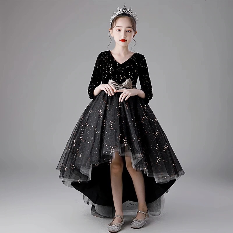 【3日出荷】ピアノ演奏ドレス 女の子 黒 長袖 ステージ 司会 冬110/120/130/140/150/160