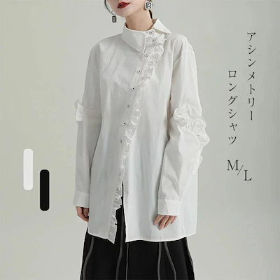 超人気,大特価 フリルブラウス シャツ ブラウス レディース トップス ロング丈 デザイン襟 長袖 斜めボタン 胸元フリル タック 無地 きれいめ モード系 変形デザイン アシンメ チュニックワンピー