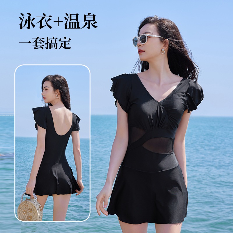 秋冬のホテル温泉水着ハイウエストで着やせvネックレディース水着フレンチフレアスリーブワンピース女