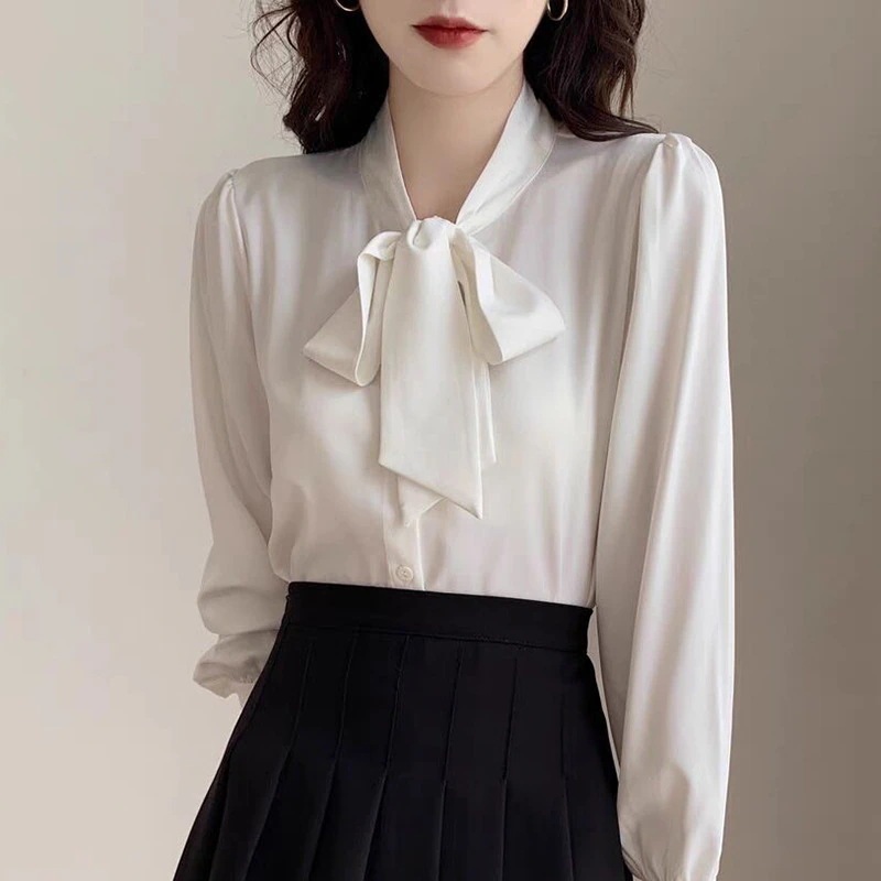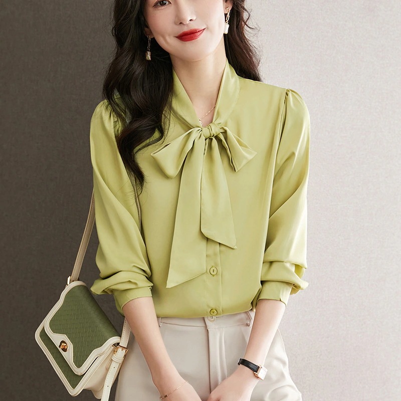 ブラウス 夏 新作 ブルー 蝶結び デザイン感 サテン 無地 通勤 オフィス リボン 春 秋 シャツブラウス レディース トップス