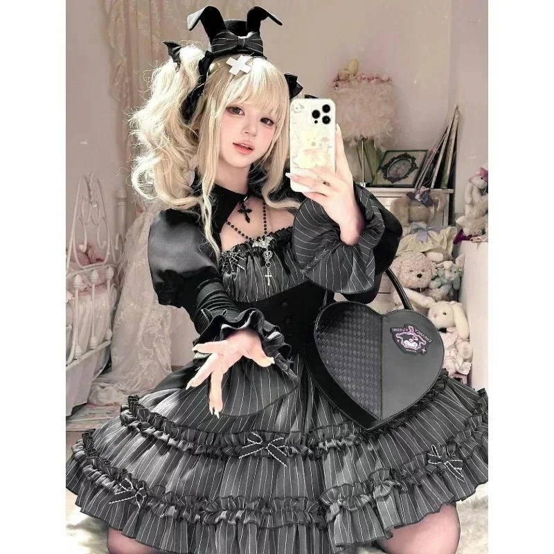 ロリータ ヴィンテージ・キャッスル ブラック ロリータ ブラウス ストライプスカート ツーピース コスプレ コスム ワンピース