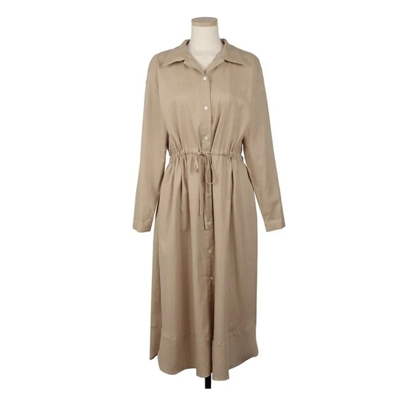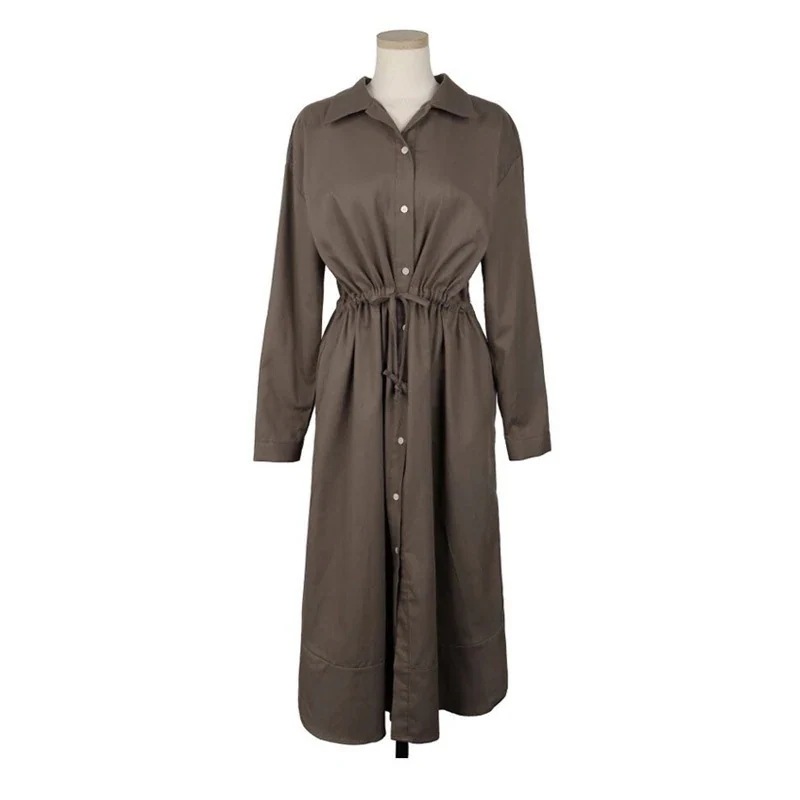 ワンピース 韓国ファッション Vネック ポリエステル Vネック ロング丈 大きいスカートの裾 プリーツ 長袖 シャツワンピース