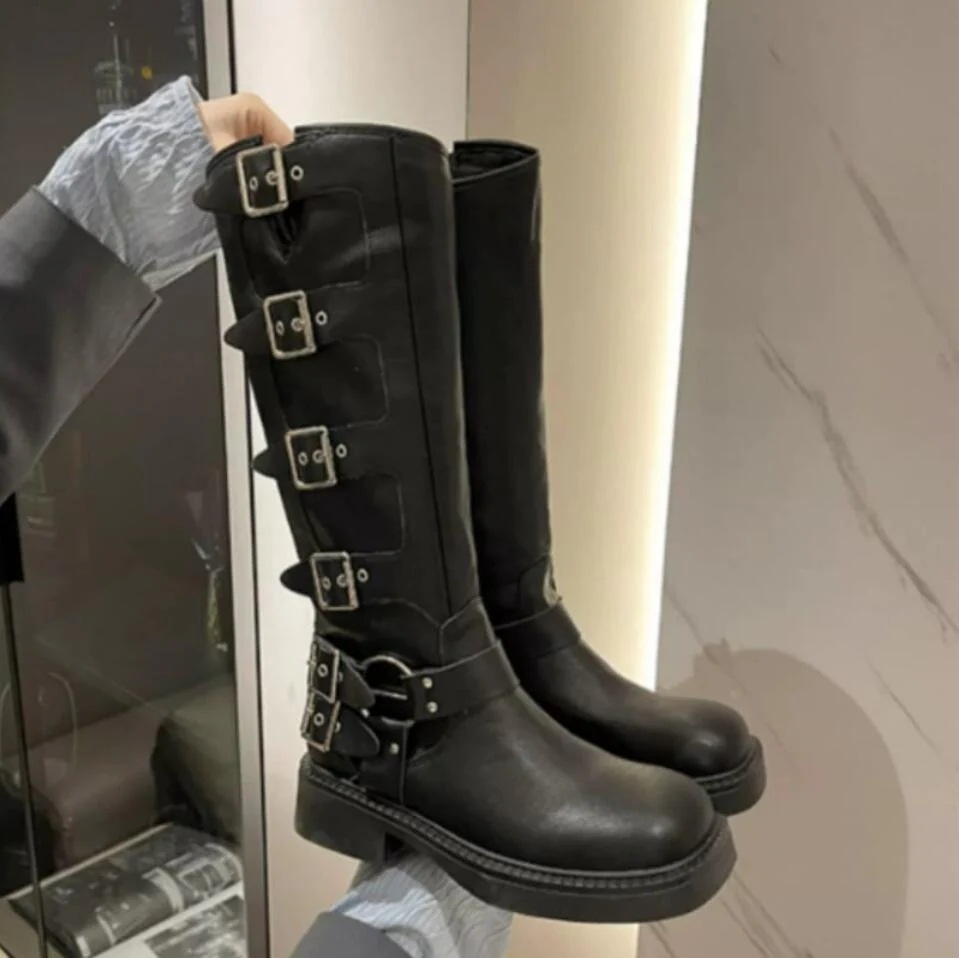 24 甘辛MIX 4cm ヒール ベルト付き ロングブーツ 靴 美脚 脚長 色っぽ 女っぽローヒールカジュアルフェイクきれいめ 大人っぽ 上品 ウエスタンブーツ PUエコゆったり フェミニンw