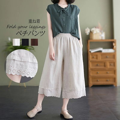 予約受付中ワイドパンツ レディース パンツ 夏 ガウチョパンツ 薄手 涼しい 春 レース ロング 9分丈 無地 レイヤード 裾レース ボトムス ガウチョ 重ね着 美脚 体型カバー ゆったり カジュアル