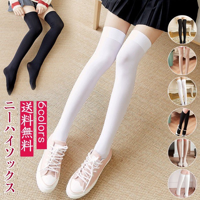 送 料 無 料ニーハイソックス白レディース女用黒ストレッチ無地学院風薄手タイプ靴下